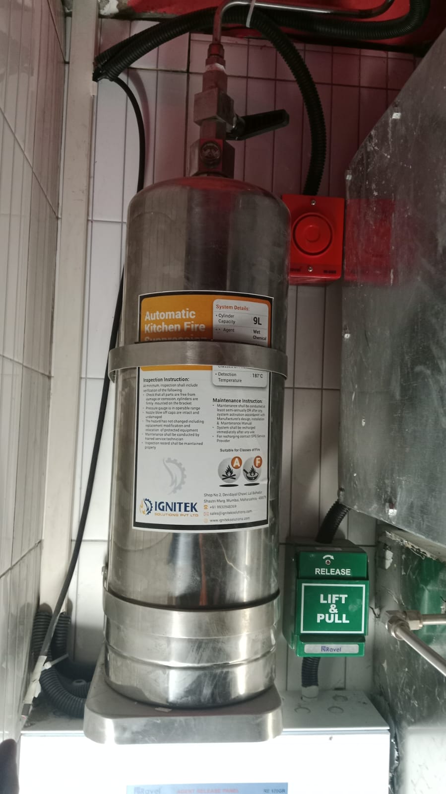 Ignitek Solution Pvt. Ltd. Kitchen Hood Fire Suppression System is specially developed for Kitchen Fire application against specific requirement A grease fire happens when your cooking oil becomes too hot. When heating, oils first start to boil, then they’ll start smoking, and then they’ll catch on fire. The System provide automatic as well as manual actuation. The system is also capable to actuate LPG/NG gas shut-off valve after actuation of the system